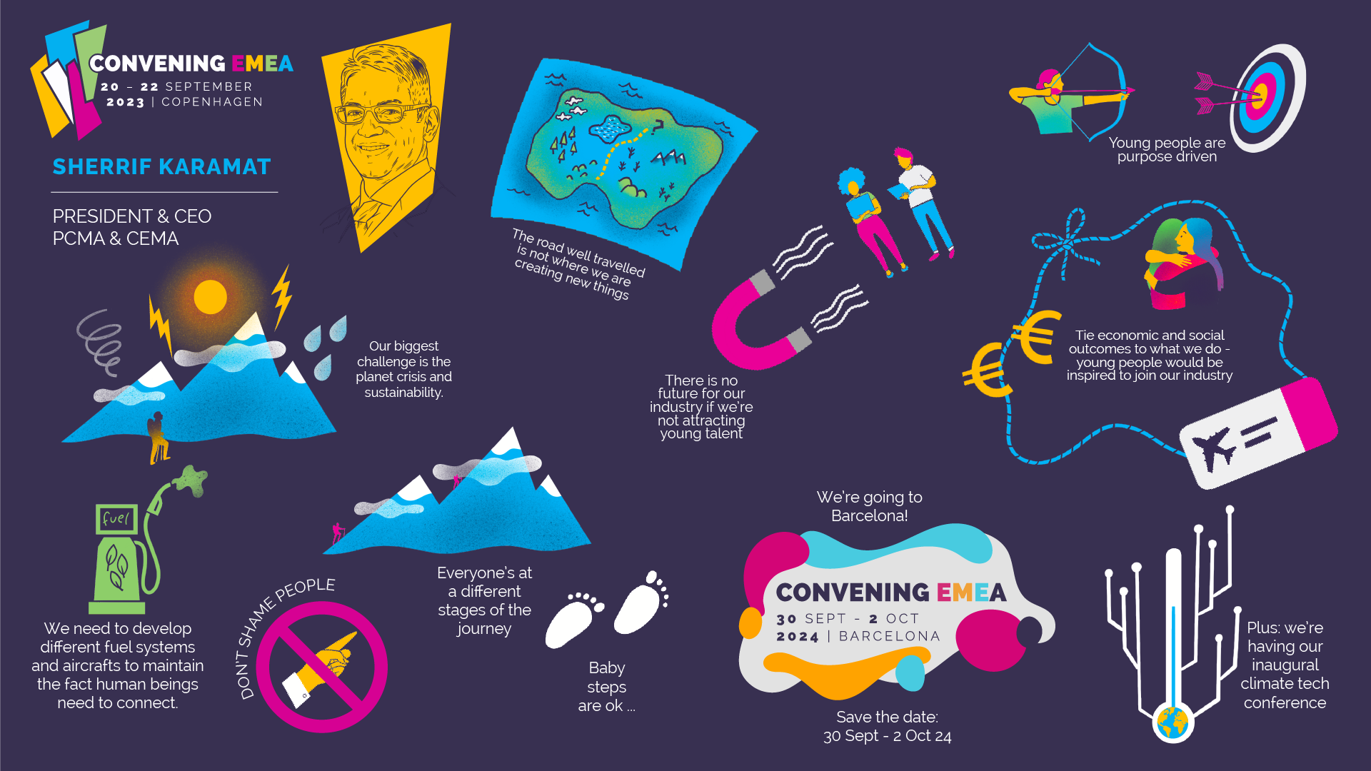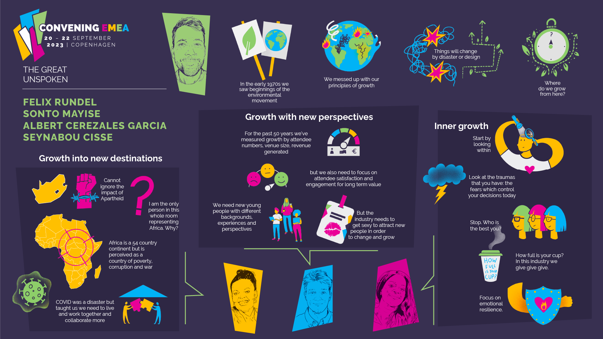 Summaries above of talks from Convening EMEA 2024 at the Bella Centre in Copenhagen. Information summary in collaboration with Caroline Beavan. The beautiful speaker portraits are by artist Mark Hooley.